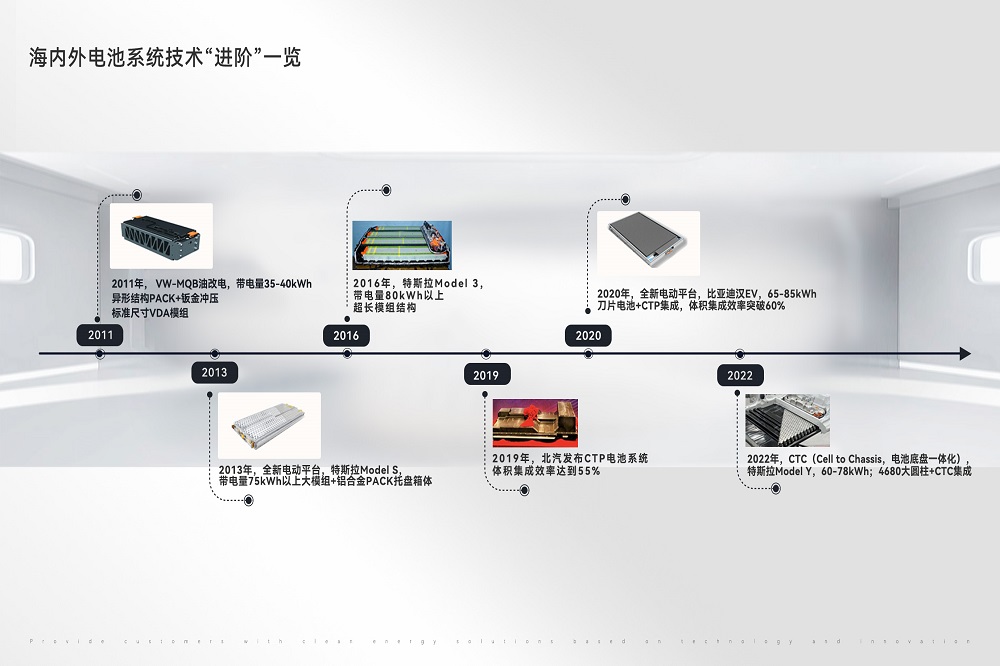近年来,随着新能源汽车的蓬勃发展,动力电池系统集成技术层出不穷、百花齐放,经历了模组结构、CTP(Cell To Pack)集成、CTC(Cell To Chassis)集成等技术路线的创新迭代。回溯动力电池系统集成技术发展史,不难发现,其主要目的在于不断提升电池系统及整车的集成效率,降低系统集成成本。