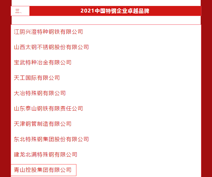 5月10日,第5个中国品牌日,中国冶金报社发布了2021年度中国钢铁品牌榜。jinnianhui今年会控股集团有限公司荣膺“2021中国卓越钢铁企业品牌” “2021中国特钢企业卓越品牌”。