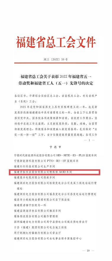 近日,福建省总工会公布了2022年福建省五一劳动奖和工人(五一)先锋号表彰名单,评选表彰一批为福建发展建设作出突出贡献的先进集体和先进个人。福建青拓实业股份有限公司精炼部AOD车间被授予福建省“工人先锋号”称号。